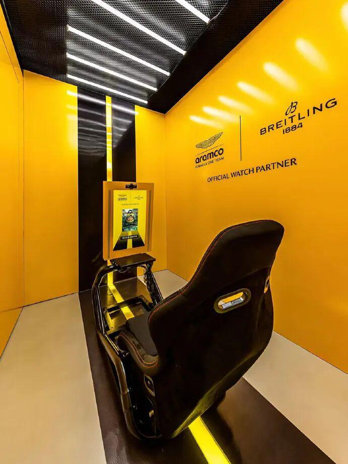 这个空间并不只是一个静态展示,百年灵显然更希望把它做成一种参与式的体验。现场设置了几组互动装置,其中就有一个向大众开放的卡莱拉赛车游戏,让大家体验加速、过弯和冲刺时的操控感。